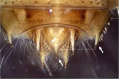 Apéndices sexuales de las hembras alcanzando la mitad del S10, (Fig. IE5, IE6)